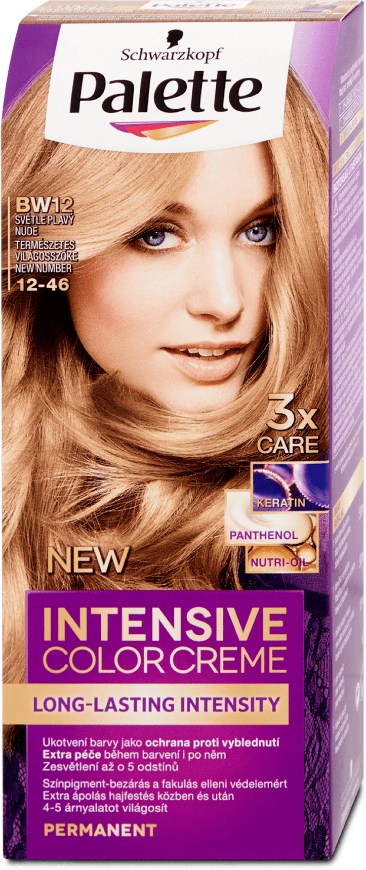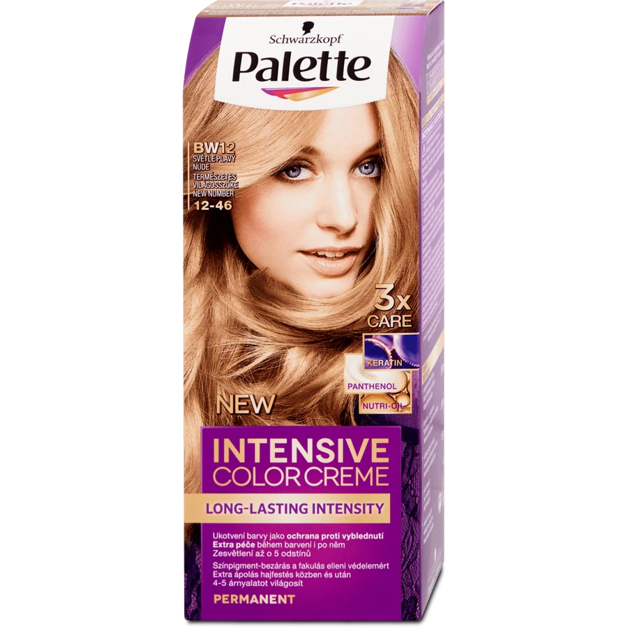 Palette Intensive Color Creme természetes világosszőke 12-46 árnyalatú tartós hajfesték hosszan tartóan intenzív színt biztosít. A speciális pigment keverék a haj világosítása közben puha, púderes színárnyalatot ér el a természetes hatású árnyalatokért. Formulája mélyen behatol a hajszerkezetbe és magába zárja a magas intenzitású színpigmenteket. Akár 3-5 árnyalatot világosít. Extra ápolást ad hajának hajfestés közben és után is, megerősíti és kényezteti a hajat. Fakulás elleni védelemmel. A hajbalzsam Tripla Ápoló Rendszerrel, keratinnal, panthenollal és nutri-olajjal gondozza a hajat. Ősz hajra nem ajánlott. A doboz elején látható modell hajának színe a bekeretezett természetes hajszínen elért színeredményt mutatja.