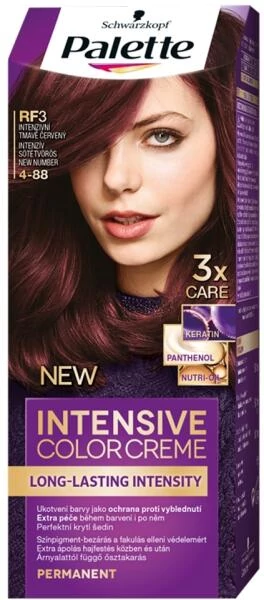 A Palette Intensive Color Creme intenzív sötétvörös 4-88 árnyalatú tartós hajfesték hosszan tartó hajszínt, akár 100%-os őszhajfedést biztosít. A speciális formula mélyen behatol a hajba, majd lezárja a színt az intenzív, tartós hajszínért. A krémhajfestékben lévő keratin, valamint az ápoló maszkban található pantenol és regeneráló szérum többszintű ápolást biztosít a hajfestés közben és után is. A hajfesték könnyen felvihető, nem csepeg, egyenletesen eloszlatható. A hajmaszk intenzíven táplálja, erősebbé* és puha tapintásúvá teszi a hajat. A legjobb eredmény elérése érdekében természetes sötétszőkétől sötétbarna hajszínig való használat ajánlott. A formula 90%-ban természetes eredetű összetevőket tartalmaz**. Az alumínium tubus és a használati útmutató újrahasznosított anyagból készült. Az összehajtható doboz FSC tanúsítvánnyal rendelkezik. * Műszeres vizsgálat a színezés előtt és után ** A termék víztartalmát is beleértve