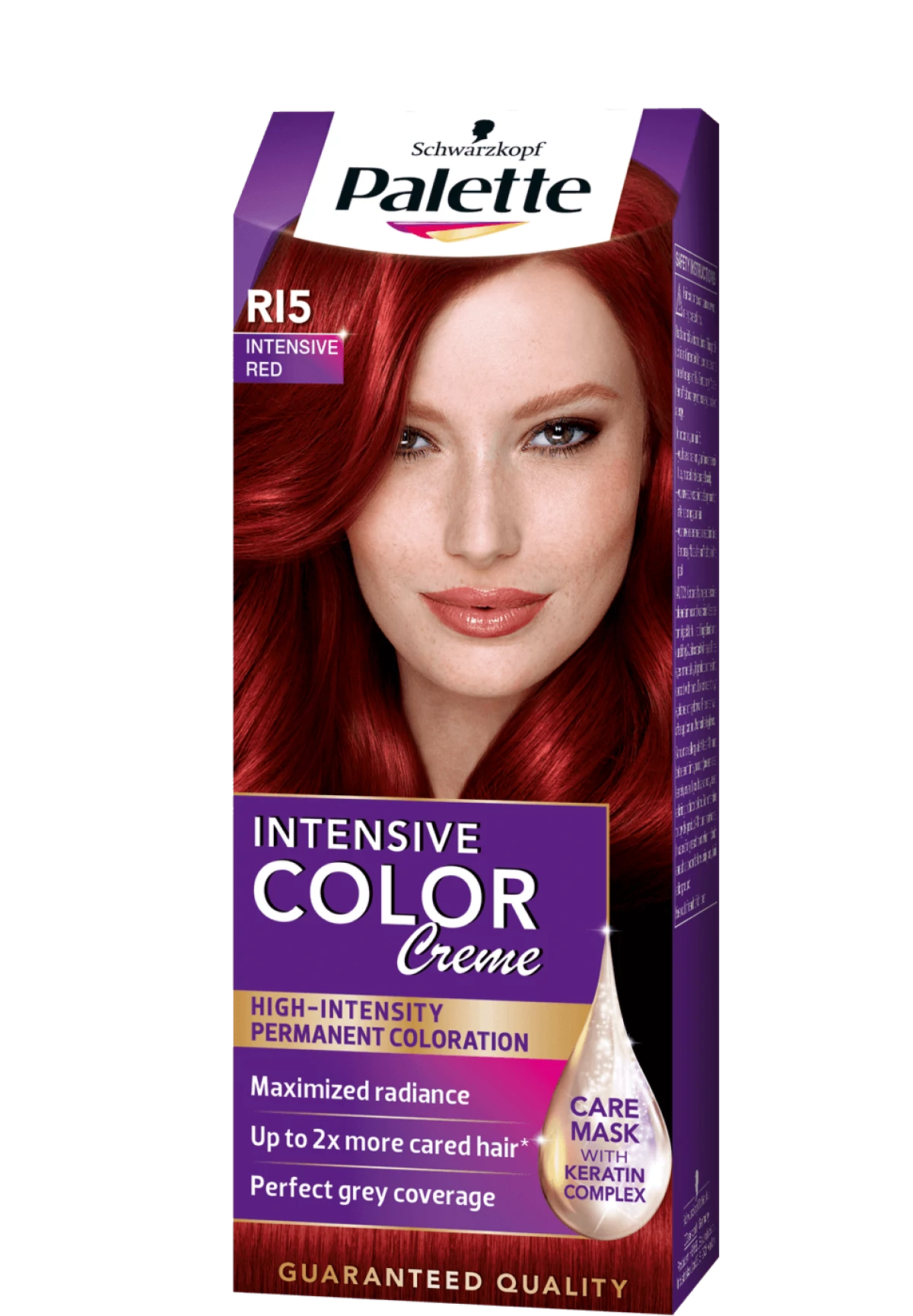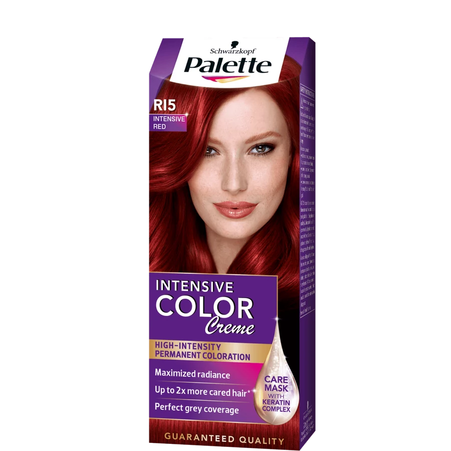 A Palette Intensive Color Creme intenzív vörös R15 (6-88) árnyalatú tartós hajfesték maximálisan intenzív színt, tartós színeredményt biztosít hajának. Nagy mértékben ősz hajra is ajánlott krémhajfesték. A formula mélyen behatol a hajba, miközben a haj szerkezetébe zárja az intenzív festék pigmenteket, ezzel biztosítva a fantasztikus ragyogást. A keratin komplexet tartalmazó balzsam extra ápolást nyújt, az erősebb, lágyabb, ragyogó, virág illatú hajért. Nagy mértékben ősz hajra is ajánlott. A doboz elején látható modell hajának színe a bekeretezett természetes hajszínen elért színeredményt mutatja.